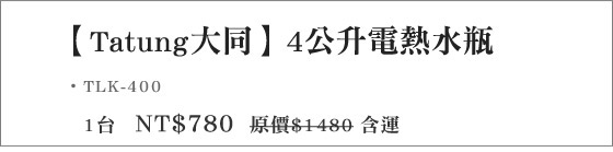 商品訊息簡述: 只要780元(含運)即可購得【Tatung大同】原價1480元4公升電熱水瓶(TLK-400)1台。